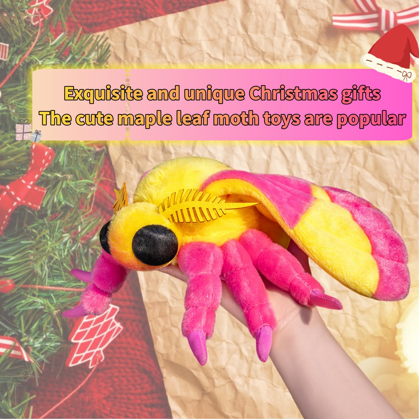 <p>Simulated design: Highly simulated maple leaf moth plush toy, furry body, pink and yellow colors, very beautiful. This moth toy is highly simulated, with tooth-like antennae, thick hair on the claws, and added color on the abdomen, making it very delicate